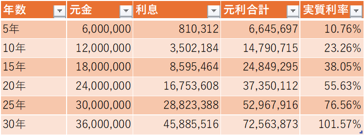 以下の表は、毎月10万円を30年間年利5%で積み立てた場合のシミュレーションです。